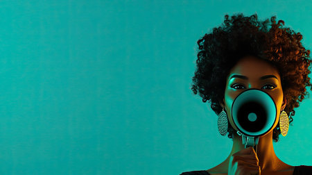 Close-up of a woman holding a megaphone speaker against a vibrant blue background. There's plenty of space for text, making it ideal for messaging, public announcements, or promotions.