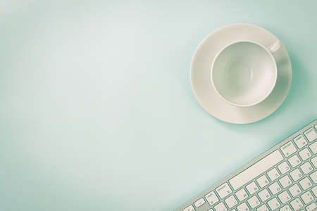 Coffee Cup and Pen and Computer Keyboard on Modern Clean Creative Office Desk or Office Table on Top View or Flat Lay. Blue Workspace Minimalist Background and Office Supplies in Vintage Tone