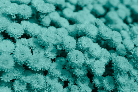 Flower pattern. Natural background of blooming beautiful chrysanthemums. Tidewater green of color, 2021 trend.