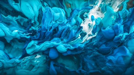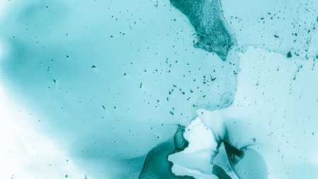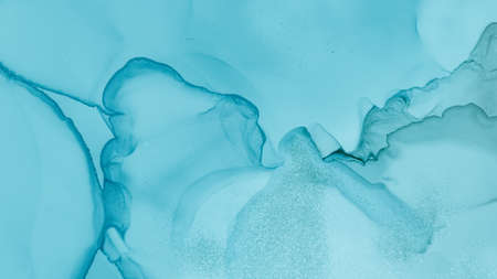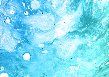 Acrylic ink water. Sea storm. Cyan blue ocean wave splash with white foam effect. Marble texture creative design. Nature art background. Mineral rock abstract pattern with fleck sparkles.