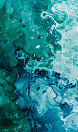 Abstract fluid acrylic painting. Marbled blue abstract background. Liquid marble pattern. Hand painted background with mixed liquid blue and green paints. Modern art.