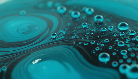 This macro shot focuses on the surface of a teal liquid, characterized by dark swirls and a multitude of small, shimmering bubbles. The swirling patterns create a sense of depth and motion, the viewer into the intricate details of the fluid. The bubbles, varying in size, are scattered across the surface, reflecting light and adding a delicate, almost ethereal to the contrast between the smooth liquid and the spherical bubbles is visually striking.