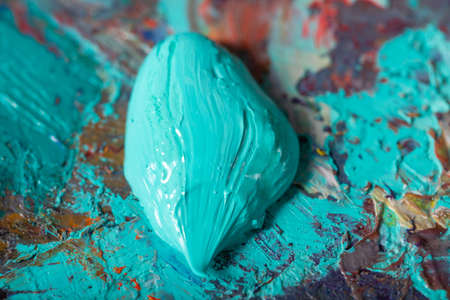 Abstract background of acrylic paints in aquamarine and orange color tones