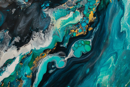 Fluid Art. Metallic Green and blue abstract waves with golden particles on black background. Marble effect background or texture