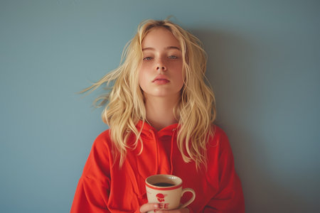 A young woman with blond hair, wearing a red hoodie, is holding a coffee mug, gazing thoughtfully away, in a studio with blue wall background and empty space for text.