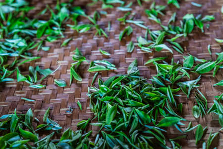 Close up shot of fresh tea leaves gathered from the plantation spread on a tray