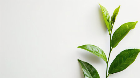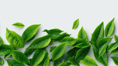 Fresh Green Tea Leaves with Water Droplets Arranged on a Clean White Background for Healthy Organic Herbal Beverage Branding, and Natural Spa Wellness Concepts Backdrop with Copyspace for Text Design