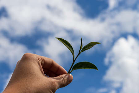 Hand pick green tea leaves and show under blue sky for freshness drinking concept