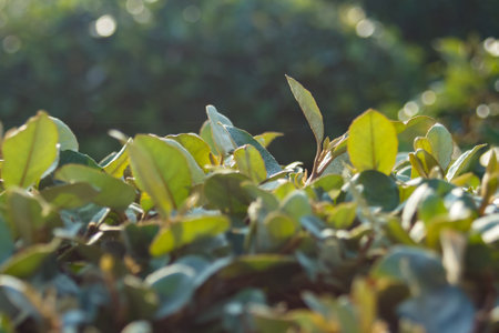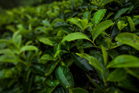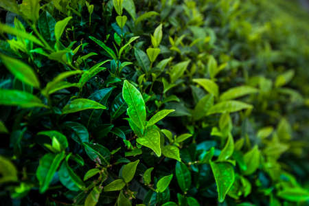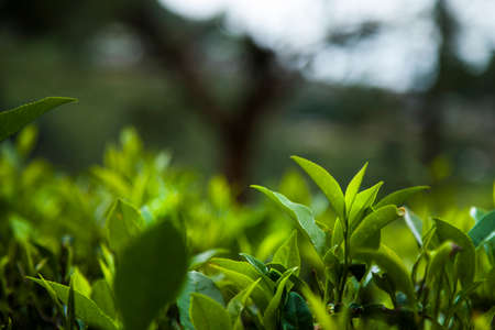 Green tea leaves in a tea plantation in morning, Tea plantations at dawn.