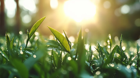 Bright fresh green tea leaves covered with morning dew under sunlight, symbolizing rejuvenation, purity, and natural beauty.