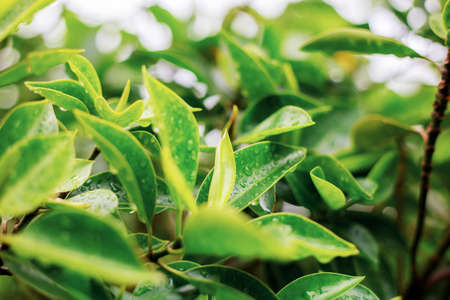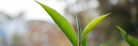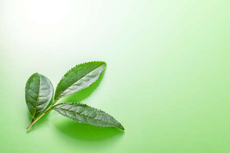 Closeup, Top of Green tea leaf in the morning, tea plantation, blurred background. A leaf of Chinese camellia, from which green and black tea are made