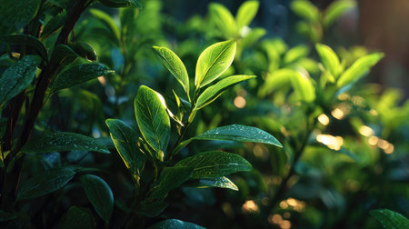 A close-up view of vibrant green tea leaves illuminated by natural sunlight, showcasing the lush beauty of nature and the freshness of organic growth in a serene environment.