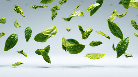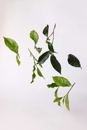 Green tea leaves flying in the air on a white background. 3d rendering