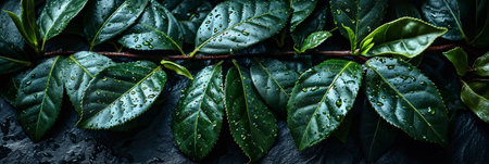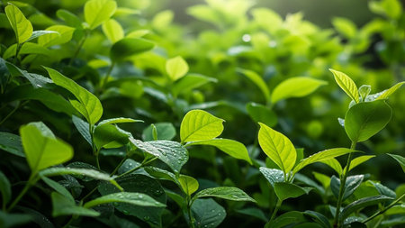Fresh green tea leaves display vibrant array of textures and shades, showcasing their natural beauty and vitality. lush foliage creates serene and calming atmosphere, perfect for nature lovers
