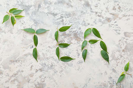 Word TEA made of green tea leaves on light background