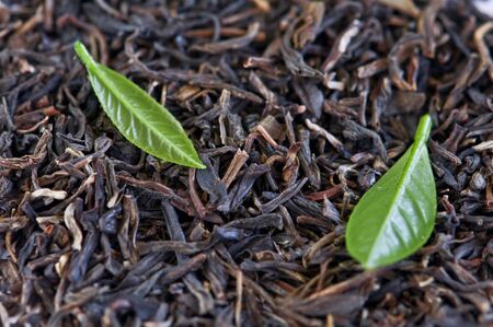 Close up of tea leaves on green background.