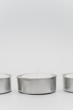 row of white scented wax tea lights on a white tabletop with copy space