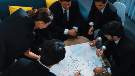 Top view of skilled diverse business people planning project by using mind map to brainstorm marketing idea. Smart start up team working together to draw mind map. Creative workplace. Directorate.