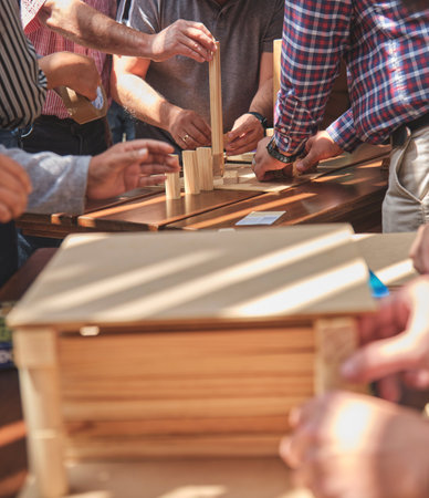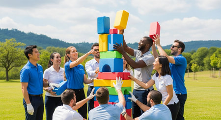 Diverse team collaborates happily on an outdoor block-building activity, fostering teamwork and creative problem-solving in a sunny environment.