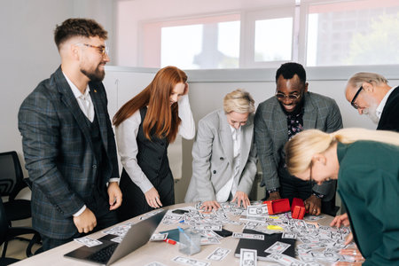 Happy successful multiethnic business team of mixed-aged diverse coworkers having fun, raise money from table, rejoicing from successful ending project. Diverse staff having party celebrating victory