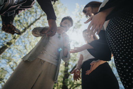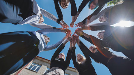Students uniting in a circle to symbolize unity and teamwork on a sunny school day
