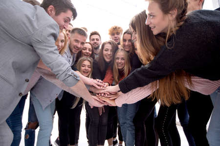 School class collection. The pupils wave their hands and run. College Students Teamwork Stacking Hand Concept. Nineteen friends.