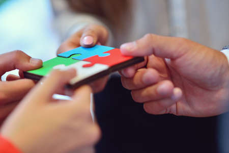 Team of business people sitting around office table and joining wooden jigsaw puzzle pieces. Group of men and women put jigsaw parts together as metaphor for teamwork and looking for solution together