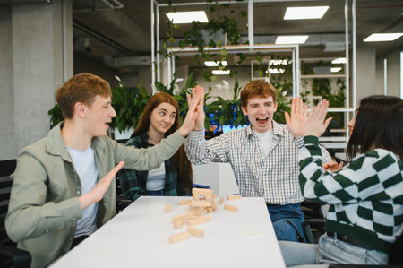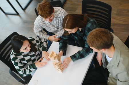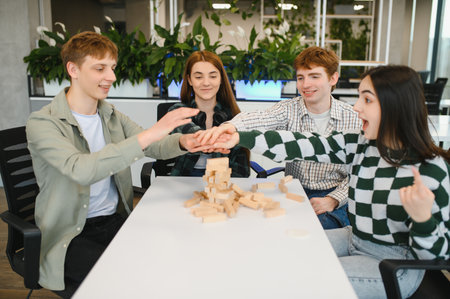 Four young coworkers are enjoying their break time playing a block game in a modern coworking space