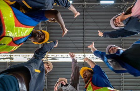 Worker in safety gear stand in a circle, shouting and raising their hand in the air. They appear enthusiastic while promoting camaraderie and teamwork. The moment capture a lively break or celebration
