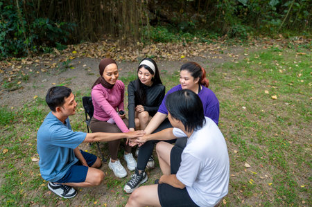 Indonesian southeast asian people in a sporty outfit, stacking hands together before practice exercise in a public park outdoors. Concept of a Healthy active lifestyle