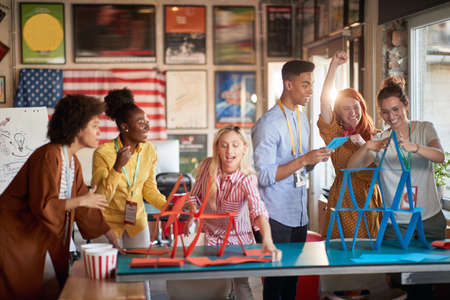 Group of young creative people is playing during a break in a cheerful atmosphere in the office