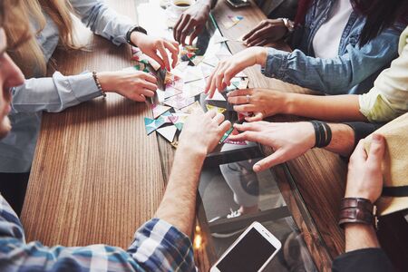 Top view of diverse business team putting hand together and clapping hand while brainstorming marketing idea or creative startup project by using sticky notes and stick at meeting table. Convocation.