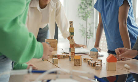 A group of coworkers engages in a team building activity using colorful blocks, fostering creativity and collaboration in a fun and interactive environment.