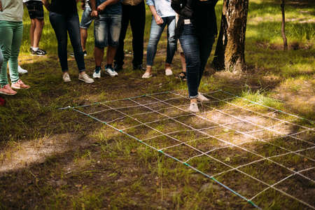 A team of employees goes through a minefield maze one after another, overcoming an obstacle. Unity, corporate, training