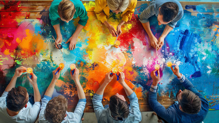 A cheerful group of young professionals uses tablets in front of a colorful mural, radiating creativity and collaboration. AIG41