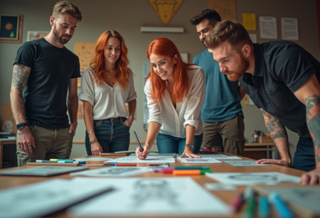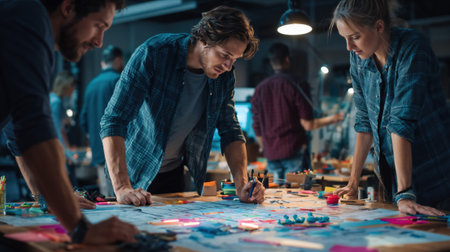 A group of creative professionals gathers around a table covered with design plans, discussing ideas and collaborating on a project. The scene captures teamwork, creativity, and dynamic problem-solving.