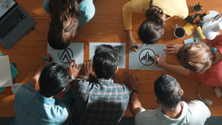 Top view of smart designer team writing comment to develop product. Professional business people working together to design logo graphic while manager explain idea to colleague at meeting. Symposium.
