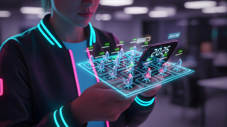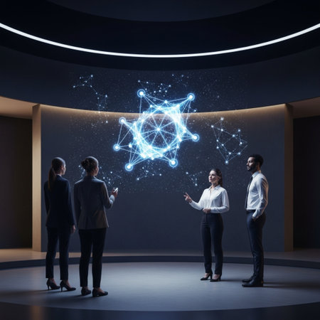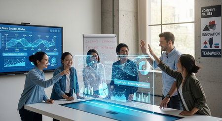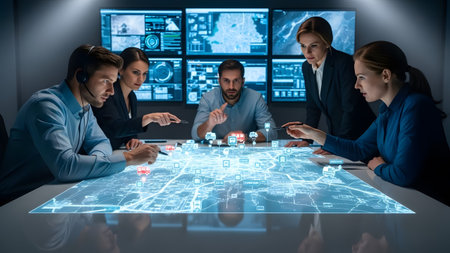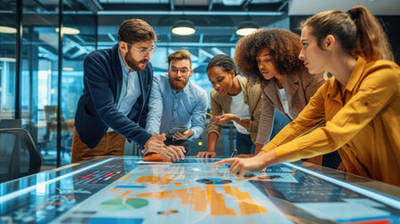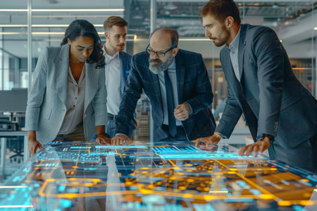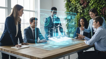 An engaged team of experts interacts with a futuristic digital interface during a strategy session in a contemporary office. AIG41