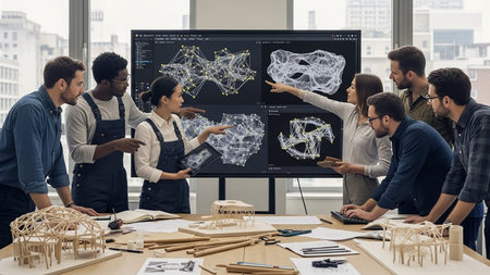 A diverse group of architects and designers are gathered around a large screen, discussing and analyzing intricate 3D models of a building structure. Various tools and models are spread out on the table, indicating a collaborative and creative environment.