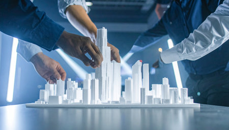 Contractors team reviews structural layout 3D models plan for urban development, balancing real estate objectives with innovation and sustainability for city planning. Site preparation.