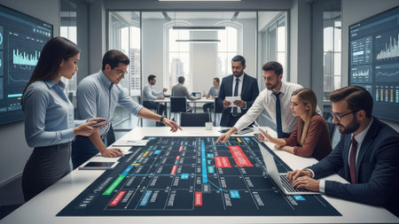 A diverse group of professionals gathers around a large table, examining complex data visualizations. The scene features a modern office interior with large display screens and bright lighting. This image could be used for illustrating business strategy, financial analysis, or technology-related content.