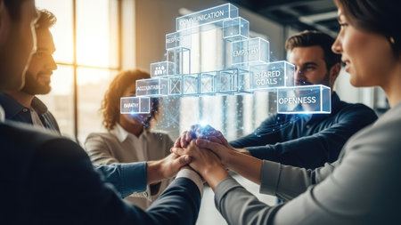 A diverse group of people join hands, interacting with a digital display of interconnected blocks. The image showcases a modern aesthetic, with cool tones and a sense of collaboration. This visually engaging scene could be used for various business, tech or motivational content.