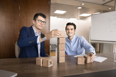 Two businessmen partners sit at conference desk engaging in collaborative activity build tower from wooden blocks, as symbol of support, synergy and shared responsibility. Business strategy, growth