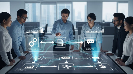 A business team gathers around a table, interacting with projected graphics depicting change management processes. They are dressed in business attire. The scene is illuminated by ambient interior lighting, with digital overlays suggesting data analysis. Suitable for use in business and financial publications, and advertising materials.