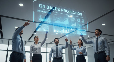 Business team analyzing sales data and projections in a modern office setting.
