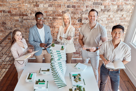 Architecture, portrait and business people in office with 3d model for planning, property development and building. Teamwork, collaboration and men and women with blueprint, engineering and design