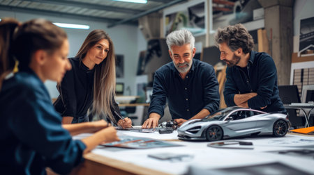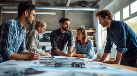 In a high-tech design studio, a team of visionary architects and engineers gather around a detailed 3D model of a future city.