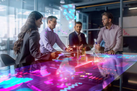 A group of business professionals in a modern office space having a meeting around a table with a holographic display projecting charts and graphs in the center.