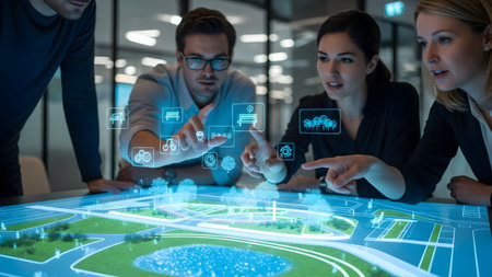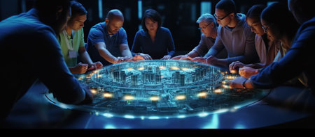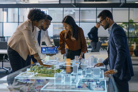 A diverse group of professionals is gathered around a large interactive table, discussing and planning a cityscape project. They are using digital tools and physical models to visualize and strategize.