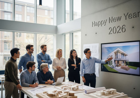A team of architects and professionals are gathered around a table, reviewing a building design displayed on a large screen. The scene suggests a New Year planning session for 2026.
